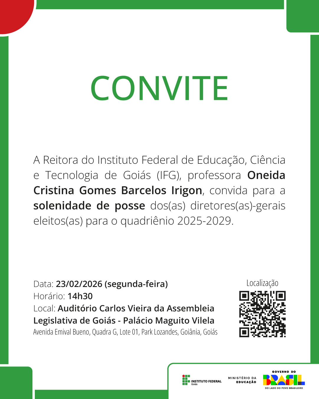 O Instituto Federal de Goiás realizará, no dia 23 de fevereiro, segunda-feira, a solenidade de posse dos 14 diretores-gerais dos câmpus da Instituição. O evento será realizado às 14h30, no Auditório Carlos Vieira da Assembleia Legislativa de Goiás.