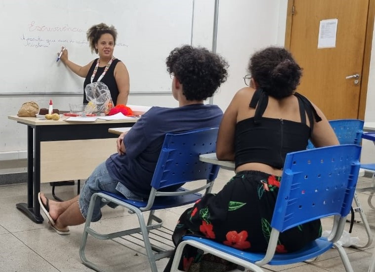 Concomitantemente à palestra, em outro espaço, a professora de Sociologia Francys Eide Nunes Leal conversava com os estudantes sobre o conceito de "escrevivência", a partir da obra de Carolina Maria de Jesus. Ao final da atividade, os participantes produziram um "caderno do tempo".