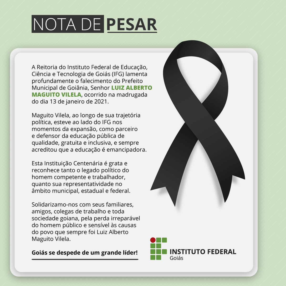 Você está aqui: Página inicial > Aluno > IFG > Comunicados da Reitoria > Nota de Pesar