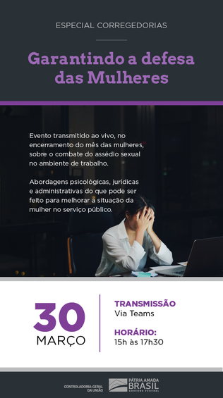 A Corregedoria-Geral da União (CGU) promove no dia 30 de março o evento “Especial Corregedorias: Garantindo a defesa das mulheres”. Encerrando o mês das mulheres, a atividade abordará sobre o combate do assédio sexual no ambiente de trabalho, com abordagens psicológicas, jurídicas e administrativas do que pode ser feito para melhorar a situação da mulher no serviço público.