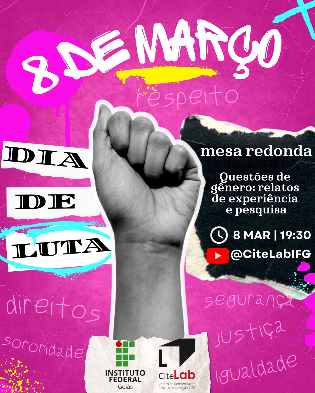 Amanhã, dia 8 de março, em comemoração ao Dia Internacional da Mulher, a Pró-Reitoria de Pesquisa e Pós- Graduação, por meio do canal do CiteLab do IFG no YouTube, realizará uma atividade integrada intercâmpus com uma mesa redonda que será transmitida, às 19h30, em uma live com o tema "Questões de gênero: relatos de experiência e pesquisa do IFG". Estarão na mesa a Reitora do IFG, Profa. Oneida Irigon, a Pró-Reitora de Pesquisa e Pós-Graduação do IFG Profa. Lorena Rosa, a Diretora de Pesquisa e Inovação do IFG, Profa. Lorenna Costa, as professoras do Câmpus Formosa Kaithy das Chagas e Uyara Ferreira, a Profa. Christiane Borges do Câmpus Luziânia, a Profa. Renatha Cruz do Câmpus Uruaçu e a Profa. Camila Roberta Estefano do Câmpus Águas Lindas. Participe!