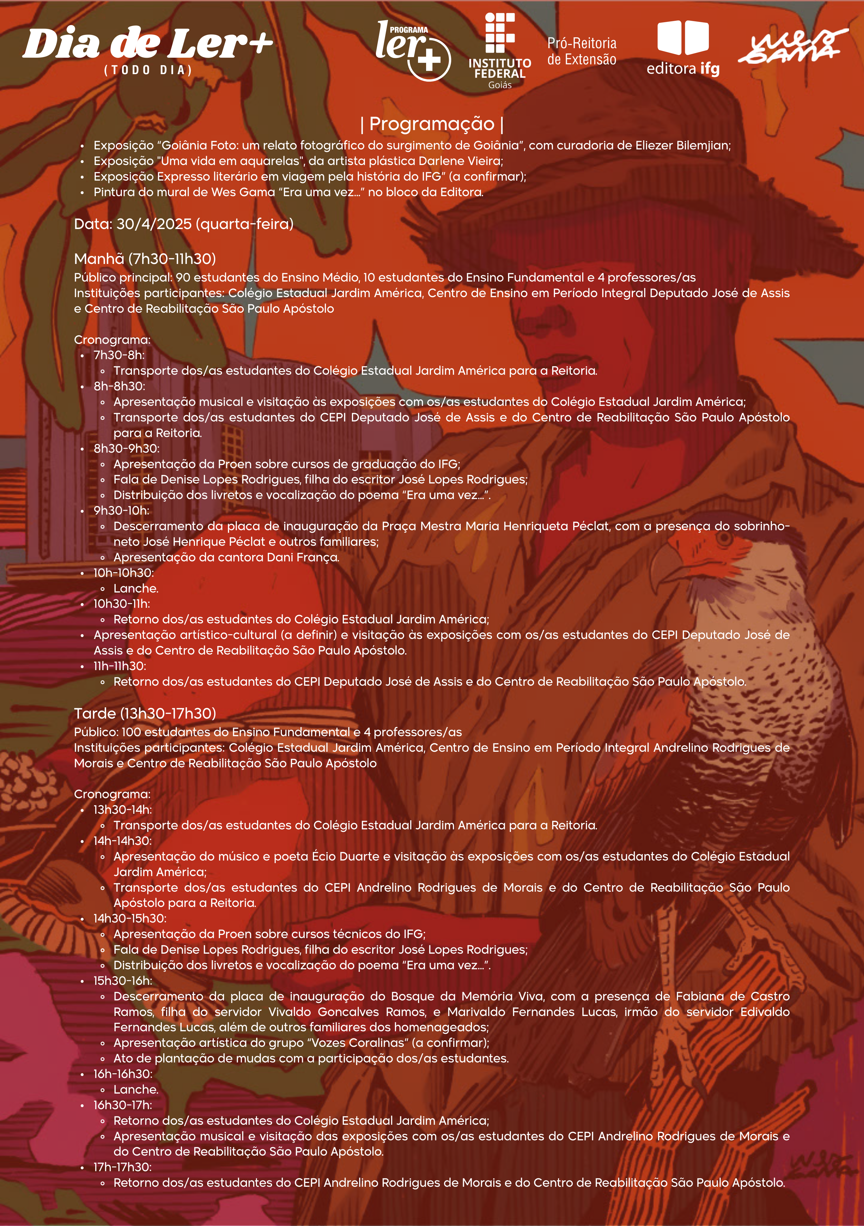 No dia 30 de abril (quarta-feira), será realizado o Dia de Ler+. O evento, que acontecerá na Reitoria do Instituto Federal de Goiás, é vinculado ao Programa de Extensão da Editora IFG.