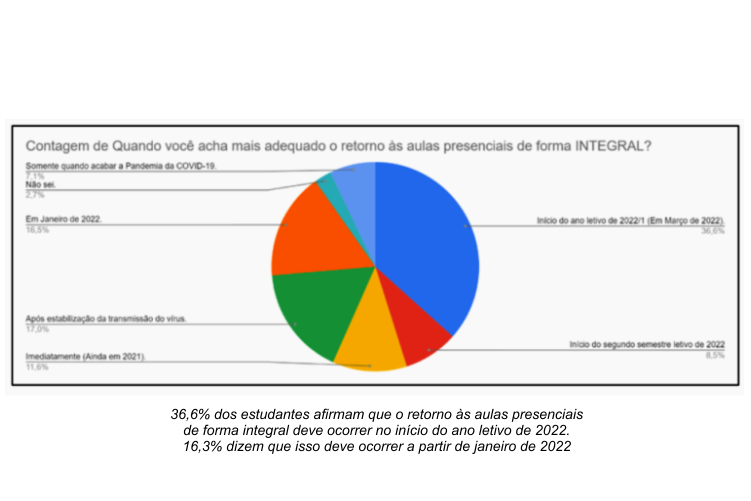 A análise das respostas da comunidade aos questionários apontou para um possível retorno total das atividades (Fase Verde) apenas no primeiro semestre do ano letivo de 2022, se o panorama daquele momento permitir. Segundo o Plano Geral do IFG, há quatro fases a se observar: que vão da mais crítica – Fase Vermelha – à mais maleável – Fase Verde. “Indicamos em cada fase quais são as nossas possibilidades, deixando flexível, em cada uma delas, sempre a possibilidade de termos atividades presenciais”, explicou o professor.
