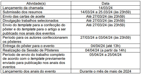 Os resumos aceitos serão apresentados em formato de pôster no dia 4 de abril, a partir das 14 horas, nas dependências do Câmpus Formosa. Os trabalhos apresentados farão parte dos anais dos eventos.