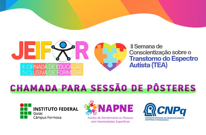 Vem aí a III Jornada de Educação Inclusiva de Formosa (Jeifor) e a II Semana de Conscientização sobre o Transtorno do Espectro Autista (TEA). O Núcleo de Atendimento às Pessoas com Necessidades Específicas (Napne) do Câmpus Formosa do Instituto Federal de Goiás (IFG) lançou hoje a Chamada para Sessão de Pôsteres para os eventos, e as inscrições, que são gratuitas, já estão abertas para Formosa e região.