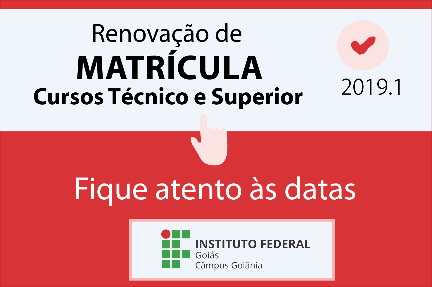 A partir do dia 11 de janeiro, os estudantes dos cursos técnicos e superiores do Câmpus Goiânia do Instituto Federal de Goiás (IFG) deverão ficar atentos aos prazos de renovação de matrículas para o primeiro semestre de 2019. A renovação deverá ser realizada por meio do sistema Q-Acadêmico.
