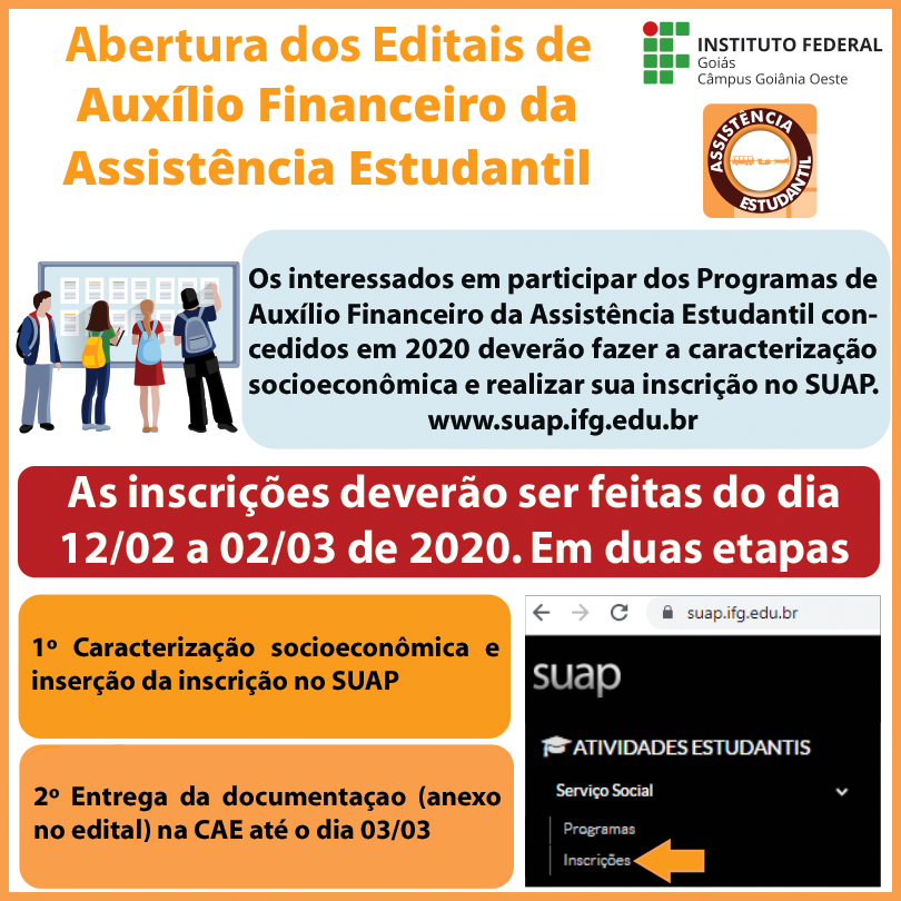 O Instituto Federal de Goiás (IFG) Câmpus Goiânia Oeste abriu dia no 12 de fevereiro o processo seletivo para a concessão dos auxílios para as seguintes modalidades: Alimentação, Moradia, Transporte, Permanência, Apoio Pedagógico e Vestuário Profissional. Os estudantes dos cursos presenciais e que pertençam à família com renda de até 1,5 salário mínimo por pessoa podem pleitear até três auxílios.