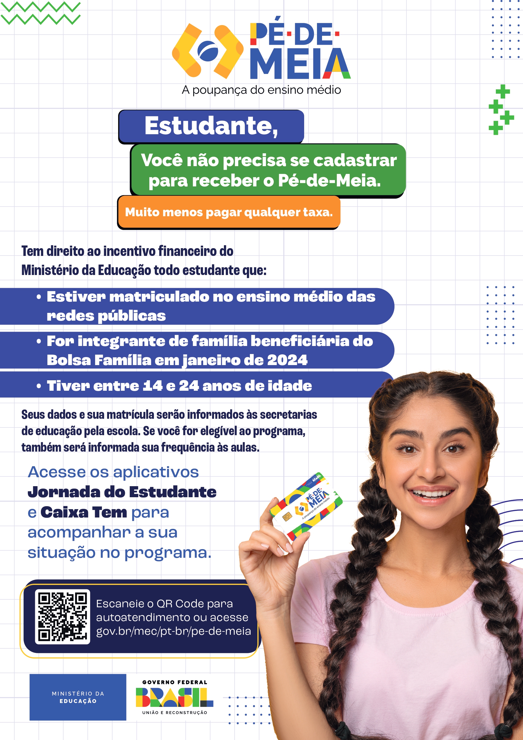 Como as informações dos estudantes foram compartilhadas com o MEC, não há necessidade alguma de fazer um cadastro para receber o Pé-de-Meia, muito menos pagar qualquer taxa. Por isso, é preciso ter atenção com informações falsas e com golpes relacionados ao Programa.