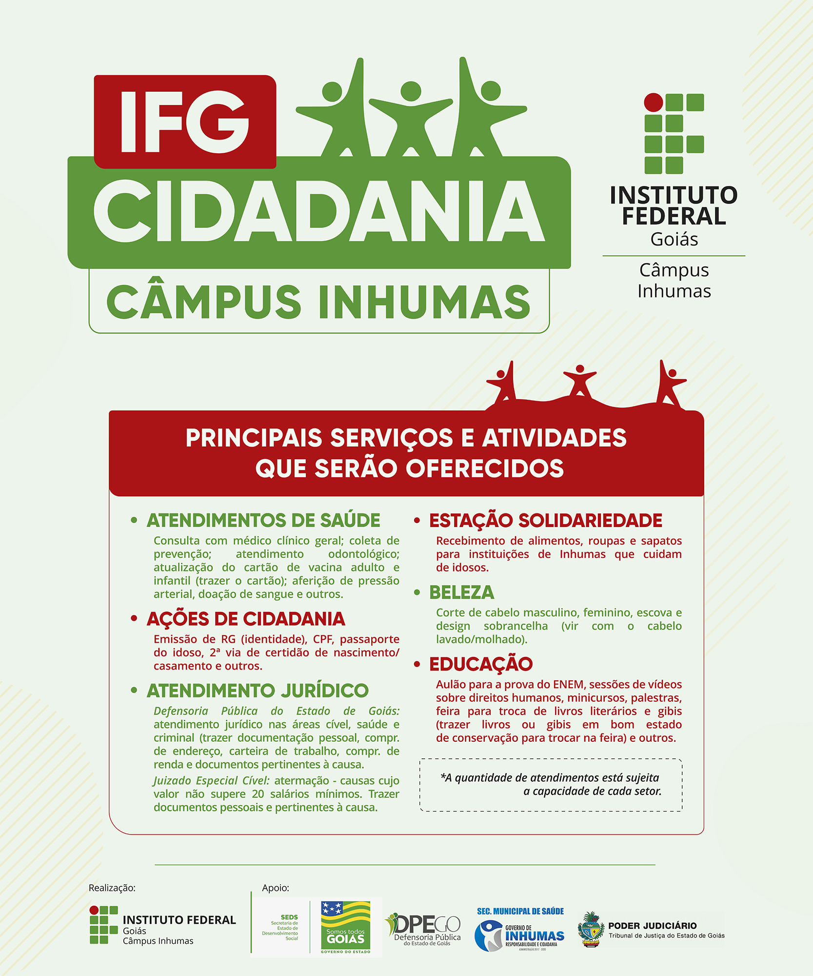 Pela primeira vez, em parceria com a Secretaria de Estado de Desenvolvimento Social (Seds), a Defensoria Pública do Estado de Goiás, a Secretaria Municipal de Saúde de Inhumas, o Tribunal de Justiça do Estado e o Ministério Público, o IFG-Câmpus Inhumas vai promover um dia de serviços voltados para a população, evento que recebeu o nome de IFG Cidadania.
