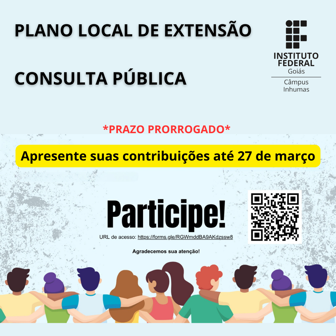 Participe da Consulta Pública do Plano Local de Extensão: https://forms.gle/21emeoKNUxU4Re8F8