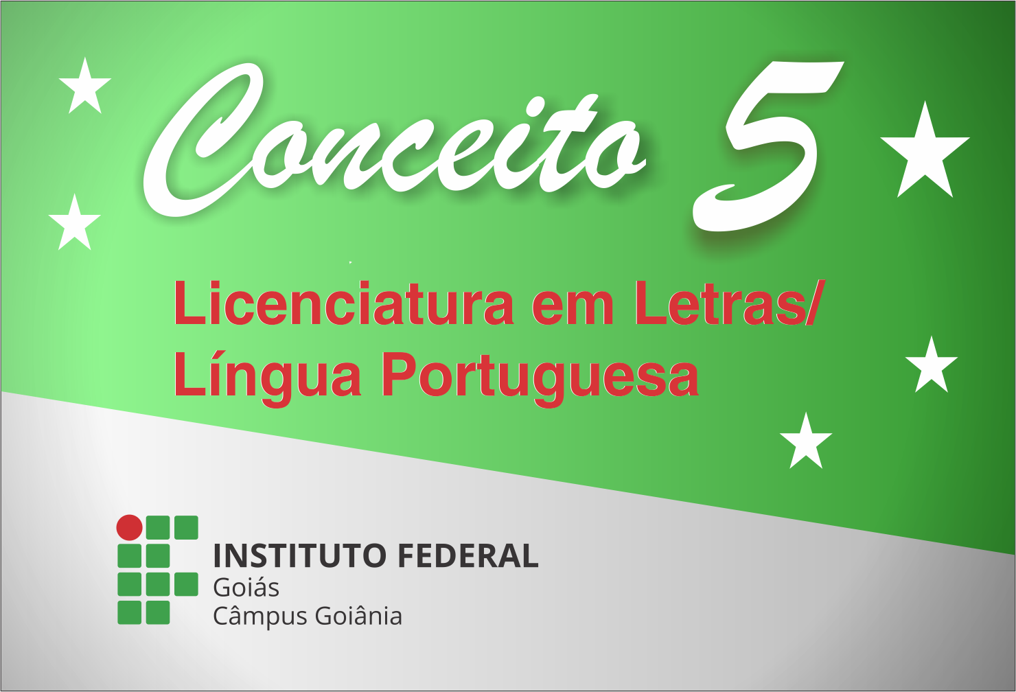 A Licenciatura em Letras - Língua Portuguesa, ofertada no Instituto Federal de Goiás (IFG) – Câmpus Goiânia, recebeu conceito 5 na primeira avaliação para reconhecimento do curso promovida por uma comissão de avaliadores designada pelo Instituto Nacional de Estudos e Pesquisas Educacionais Anísio Teixeira (Inep) e Ministério da Educação (MEC). A nota 5 refere-se ao conceito máximo de avaliação do curso, numa escala que varia de 1 (desempenho insatisfatório) a 5 (bom desempenho). O relatório da avaliação está disponível na página da Procuradoria Educacional Institucional (PEI) do IFG.