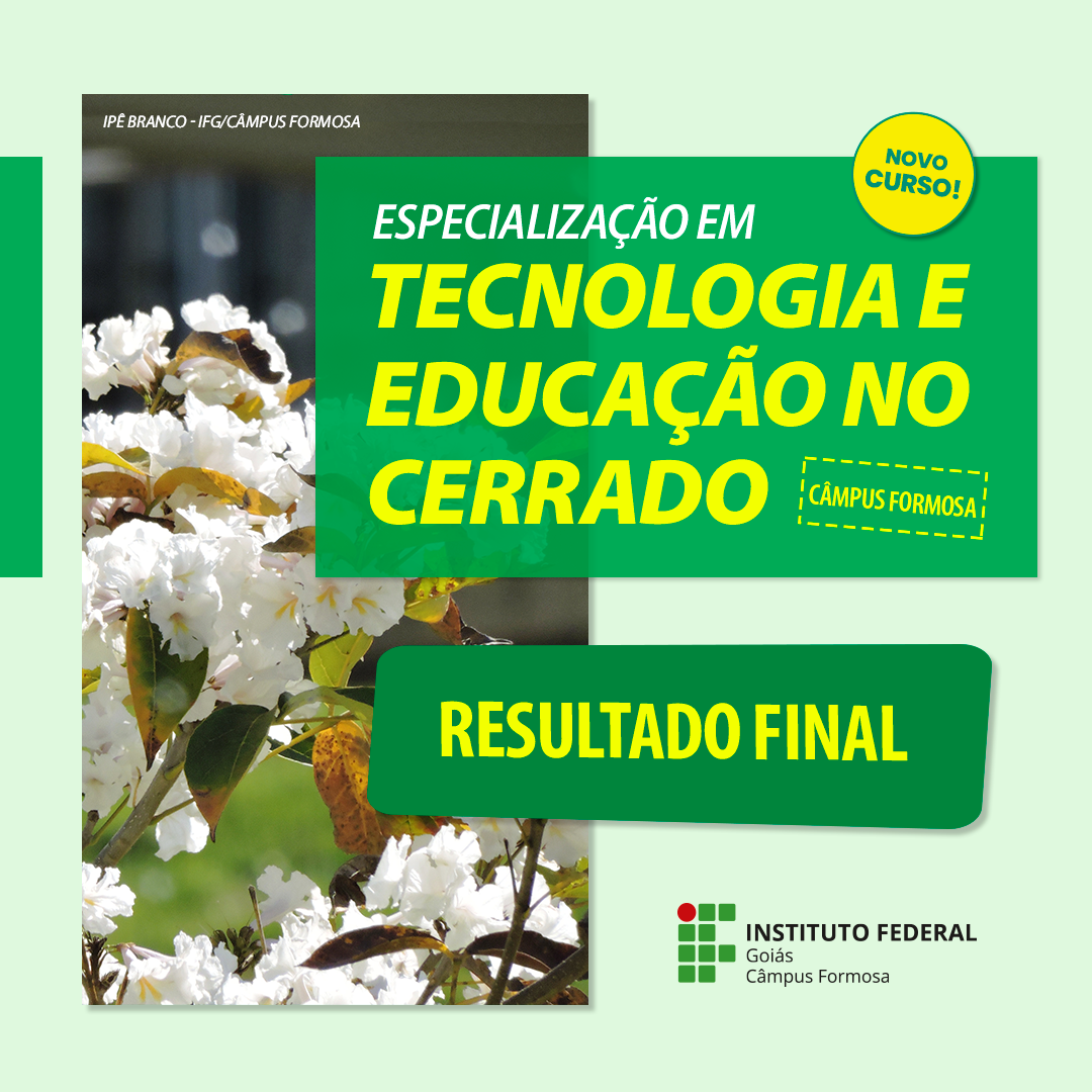 Foi publicado hoje o resultado final do processo seletivo para o curso de Pós-Graduação Lato Sensu Tecnologia e Educação no Cerrado, ofertado pela primeira vez pelo Câmpus Formosa do Instituto Federal de Goiás. Os selecionados devem ficar atentos ao período de matrícula, que vai de 29 de setembro a 4 de outubro.