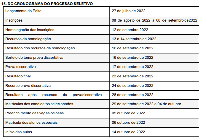 Amanhã será o dia para apresentar recurso da prova dissertativa, e o resultado do recurso sairá dia 28 de outubro. Caso as vagas não sejam totalmente preenchidas, no dia 5 de outubro, poderá haver o preenchimento das vagas ociosas, e no dia 6, a matrícula para estes candidatos. As aulas terão início em 14 de outubro.