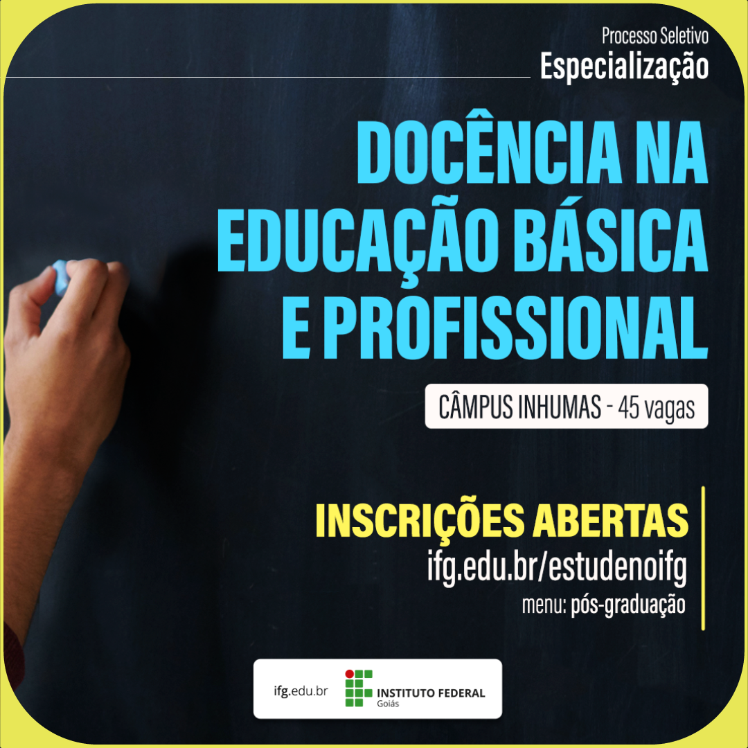 Estão abertas, até o dia 1º de dezembro, as inscrições para a seleção do curso de especialização em Docência na Educação Básica e Profissional, ofertado no IFG-Câmpus Inhumas, na modalidade presencial. O edital e as informações estão publicados na página de pós-graduação: http://www.ifg.edu.br/estude-no-ifg/selecoes-em-andamento/pos-graduacao. O curso é gratuito.