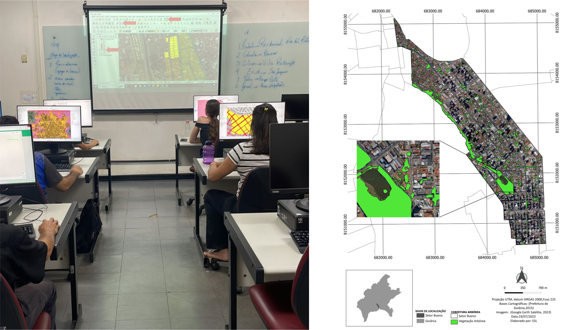 Pesquisa desenvolvida como produto final da disciplina de Geoprocessamento do curso técnico subsequente em Agrimensura do Câmpus Goiânia do Instituto Federal de Goiás (IFG) revelou que apenas 12% da área total do Setor Bueno, na Capital, possui permeabilidade. Enquanto isso, 88% do território do bairro é coberto – seja por asfalto, calçada, telhados, entre outros – totalizando 3,69 km² de impermeabilidade. A pesquisa foi orientada pela professora substituta do Câmpus Goiânia, Estéfane da Silva Lopes, em parceria com os estudantes Gabriela Nogueira, Isabela Caroline, Josael Neves Mariano, Lilian Alves e do coordenador do curso técnico em Agrimensura, o professor Halan Faria Lima.