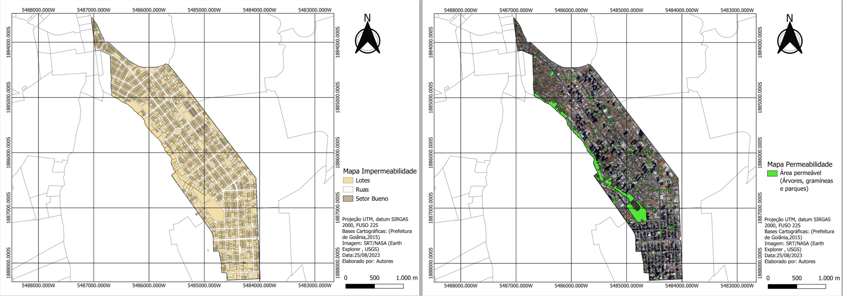 Nos mapas feitos pelo estudo: áreas de impermeabilidade são representadas na figura à esquerda, enquanto as de permeabilidade estão no mapa à direita