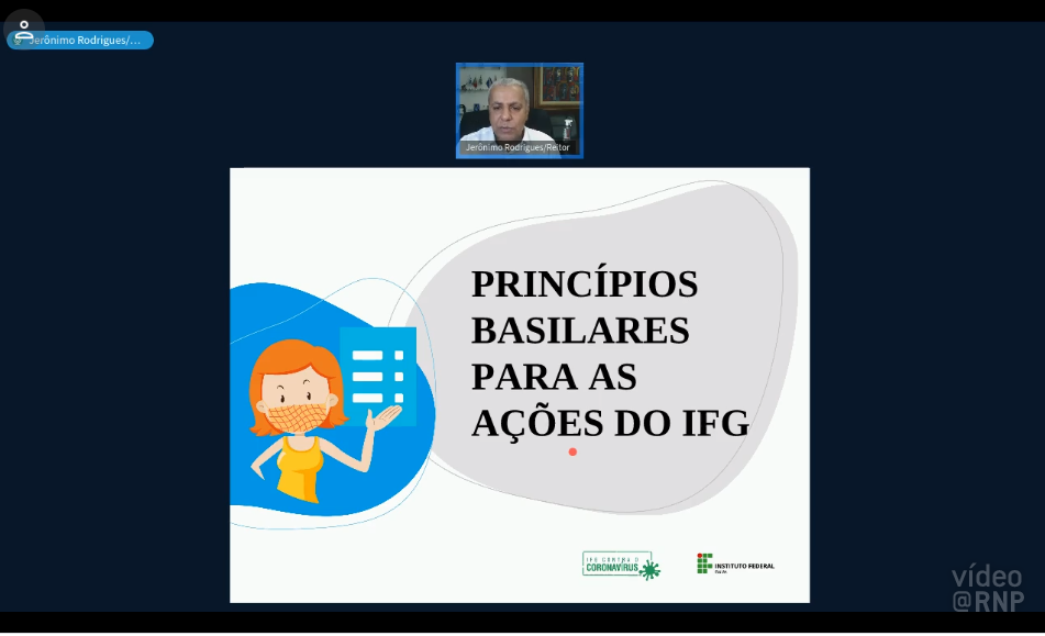 O encontro virtual foi conduzido pela diretora executiva do IFG, Adriana dos Reis Ferreira. O primeiro a se manifestar foi o reitor do Instituto que expressou sua satisfação em dialogar com a comunidade e comentou que nesses quase 150 dias de afastamento provocados pela pandemia do novo coronavírus, a Instituição tem trabalhado efetivamente em ações de prevenção ao vírus.