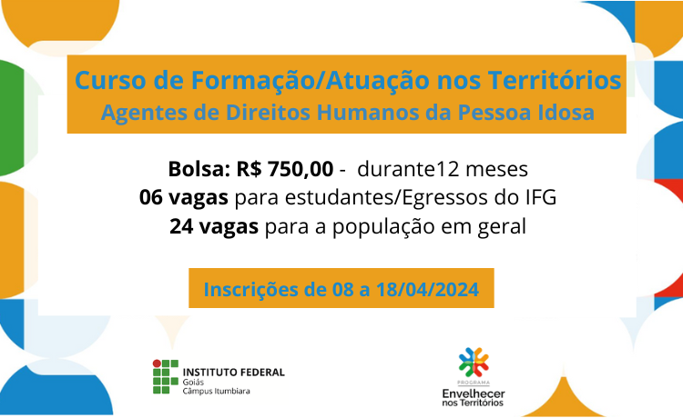 Estão abertas as inscrições para o curso de formação de Agente de Direitos Humanos da Pessoa Idosa, do programa Envelhecer nos Territórios*, que está sendo ofertado pelo IFG Câmpus Itumbiara. Pode participar desse processo seletivo qualquer pessoa com mais de 18 anos de idade, que tenha concluído o Ensino Fundamental e tenha disponibilidade de 20 horas semanais para realização das etapas do curso.