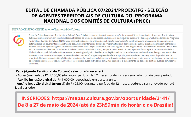 Edital de Chamada Pública 07/2024/PROEX/IFG – Seleção de agentes territoriais de cultura do Programa Nacional dos Comitês de Cultura (PNCC): https://ifg.edu.br/editais-extensao