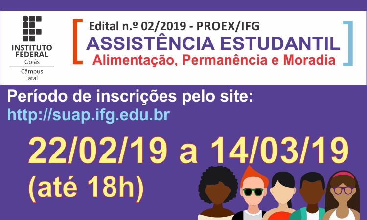 Estão abertas as inscrições para os auxílios estudantis oferecidos pelo Instituto Federal de Goiás (IFG) – Câmpus Jataí. Para participar da seleção, os estudantes deverão se inscrever no Suap, a partir do endereço www.suap.ifg.edu.br até o próximo dia 14 de março. O processo compreende os auxílios moradia, permanência e alimentação.