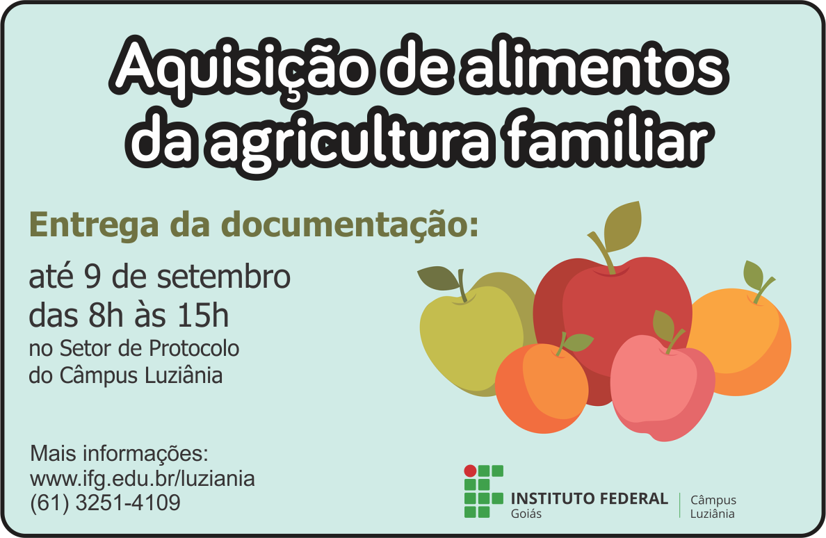 Está aí uma oportunidade para os agricultores familiares de Luziânia e região. O Instituto Federal de Goiás – Câmpus Luziânia publicou chamada pública para a compra de gêneros alimentícios produzidos por agricultores familiares. O edital contempla a aquisição de banana, tangerina Ponkan, laranja, maçã, rapadura e polpa de frutas (sabores diversos).