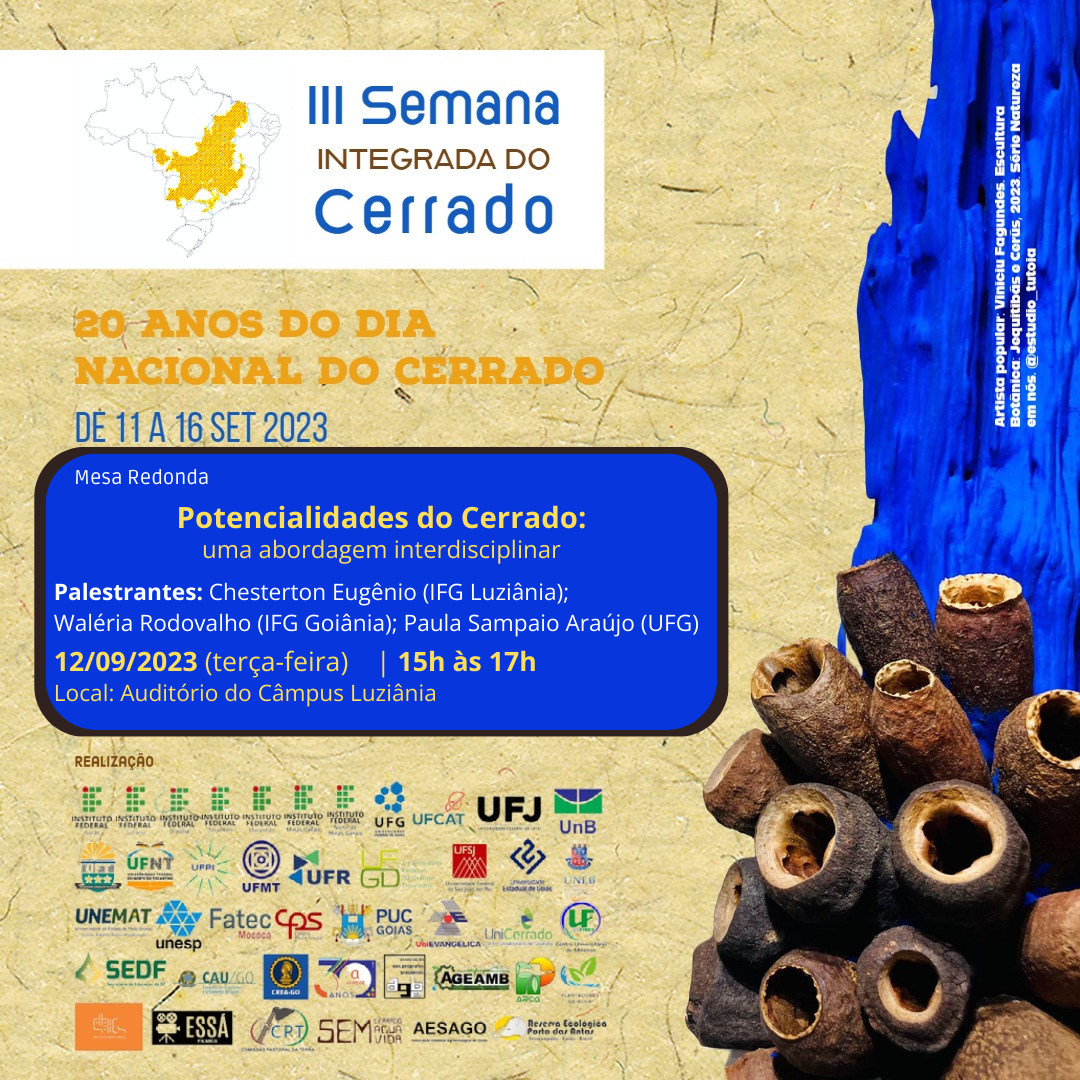 O Câmpus Luziânia do IFG realiza na tarde de hoje, 12, a mesa redonda Potencialidades do Cerrado: uma abordagem interdisciplinar. Podem participar pessoas da comunidade, alunos e servidores do câmpus. A inscrição é gratuita e pode ser feita pelo link: https://sugep.ifg.edu.br/eventos/#/publico/eventos/ab78ff7f-a546-4ff7-b314-869d06bf2b14/inscricao