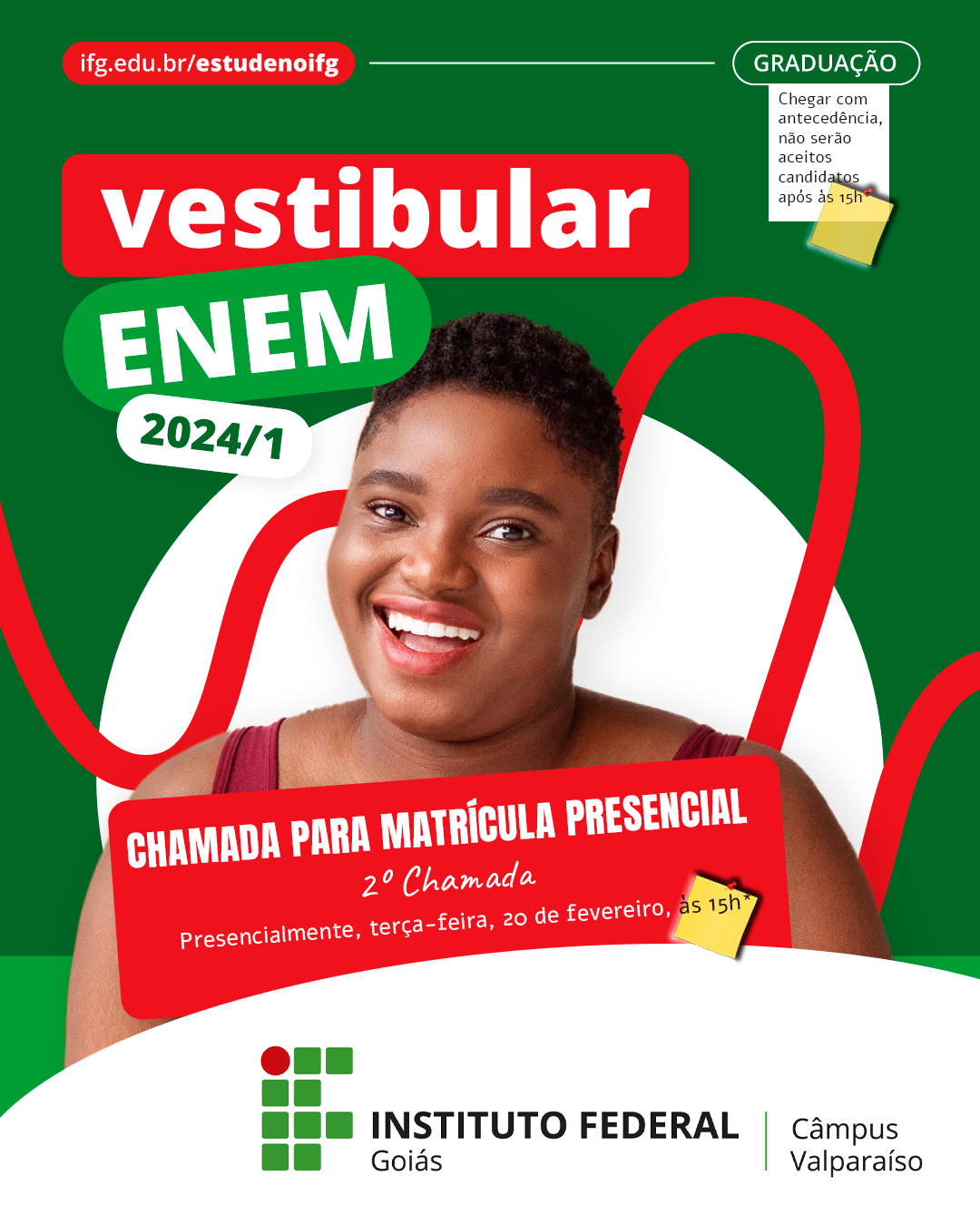 Olá! Você que está participando da seleção Vestibular Enem 2024-1, atenção! As vagas não preenchidas na 1º Chamada do IFG Câmpus Valparaíso, agora vão ser disponibilizadas na Chamada para Matrícula Presencial, que ocorre nesta terça-feira, 20 de fevereiro, às 15h, presencialmente. Comparecer com antecedência, porque quem chegar posteriormente a esse horário não poderá participar. Como irá funcionar esta Chamada? Todos os candidatos que estão na lista de espera desta seletiva estão convocados a comparecer. Entre os presentes, será considerada a ordem do resultado final. Ainda para obter a vaga, será verificada a documentação, caso não esteja completa, a oportunidade passa para o próximo candidato presente, de acordo com a distribuição das vagas e ordem de classificação.