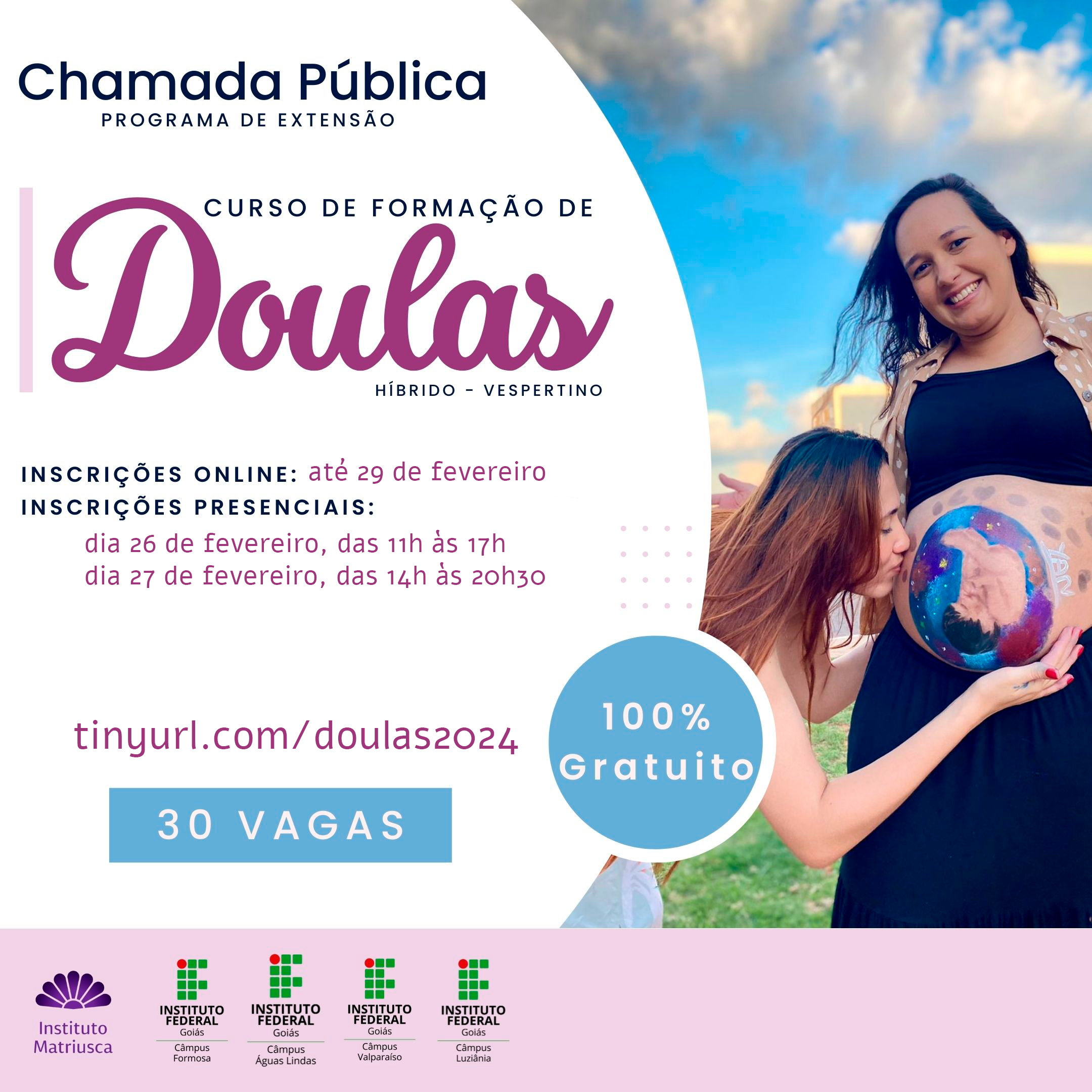 Oi! Você que tem interesse em nosso curso de Formação de Doulas, estamos com inscrições on-line abertas até o dia 29 de fevereiro e a presencial no IFG Câmpus Valparaíso no dia 26 de fevereiro das 11h às 17h; e no dia 27 de fevereiro, das 14h às 20h30. A seleção consiste nas etapas: inscrição, palestra e sorteio. A palestra e sorteio ocorrem no dia 6 de março, às 14h30, no auditório do Câmpus Valparaíso. Atenção! Esteja no dia da palestra com a documentação de matrícula, caso a candidata seja contemplada com uma vaga, a matrícula será feita no mesmo dia, então, trazer original e fotocópia da Carteira de Identidade, CPF e comprovante de endereço. Inscrições, Edital  e outras informações em: tinyurl.com/doulas2024
