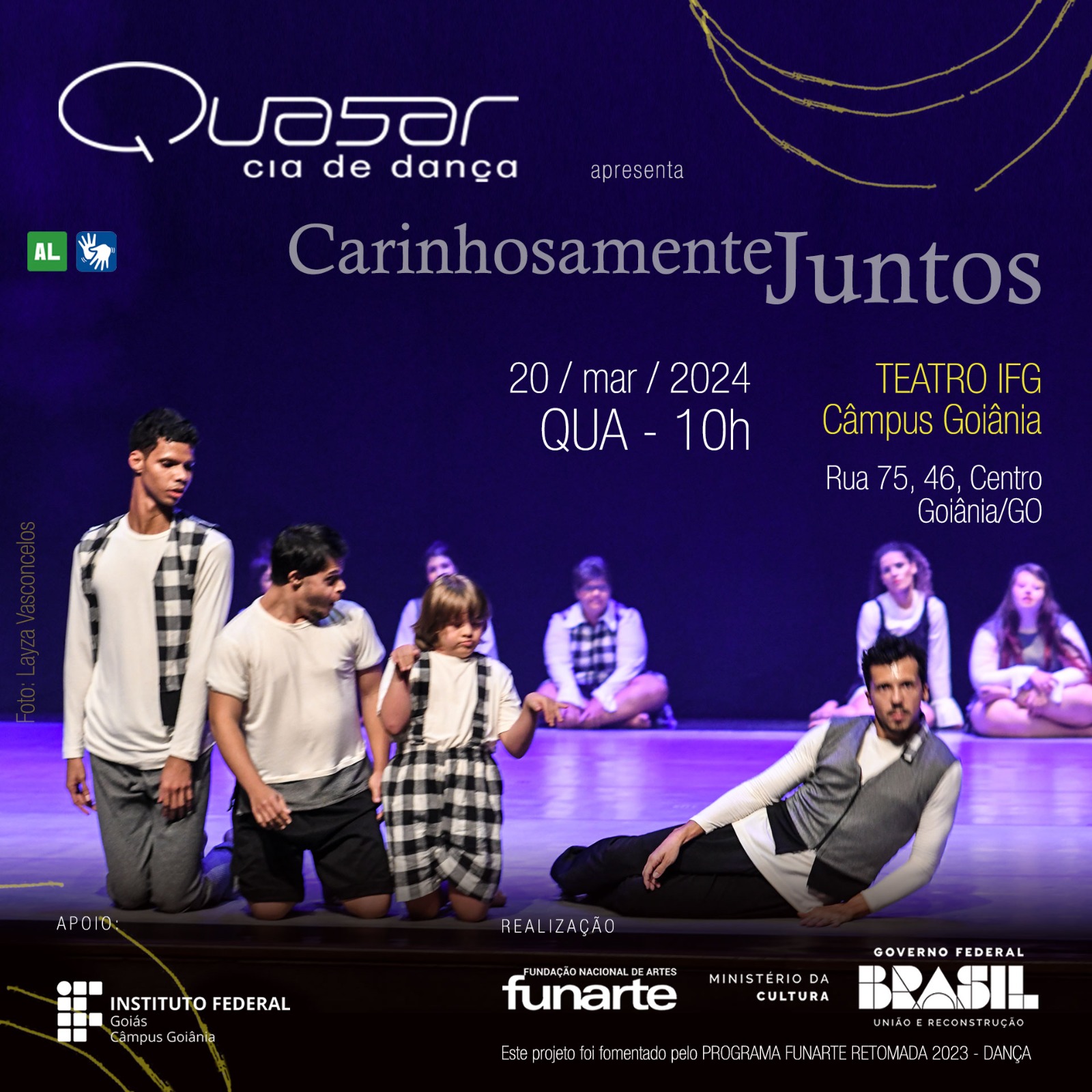 O Teatro do Câmpus Goiânia do Instituto Federal de Goiás (IFG) recebe no dia 20 de março a Quasar Cia. de Dança para uma apresentação exclusiva para servidores e estudantes da unidade. O espetáculo intitulado Carinhosamente Juntos terá duração de 55 minutos e será às 10 horas. A classificação é livre.