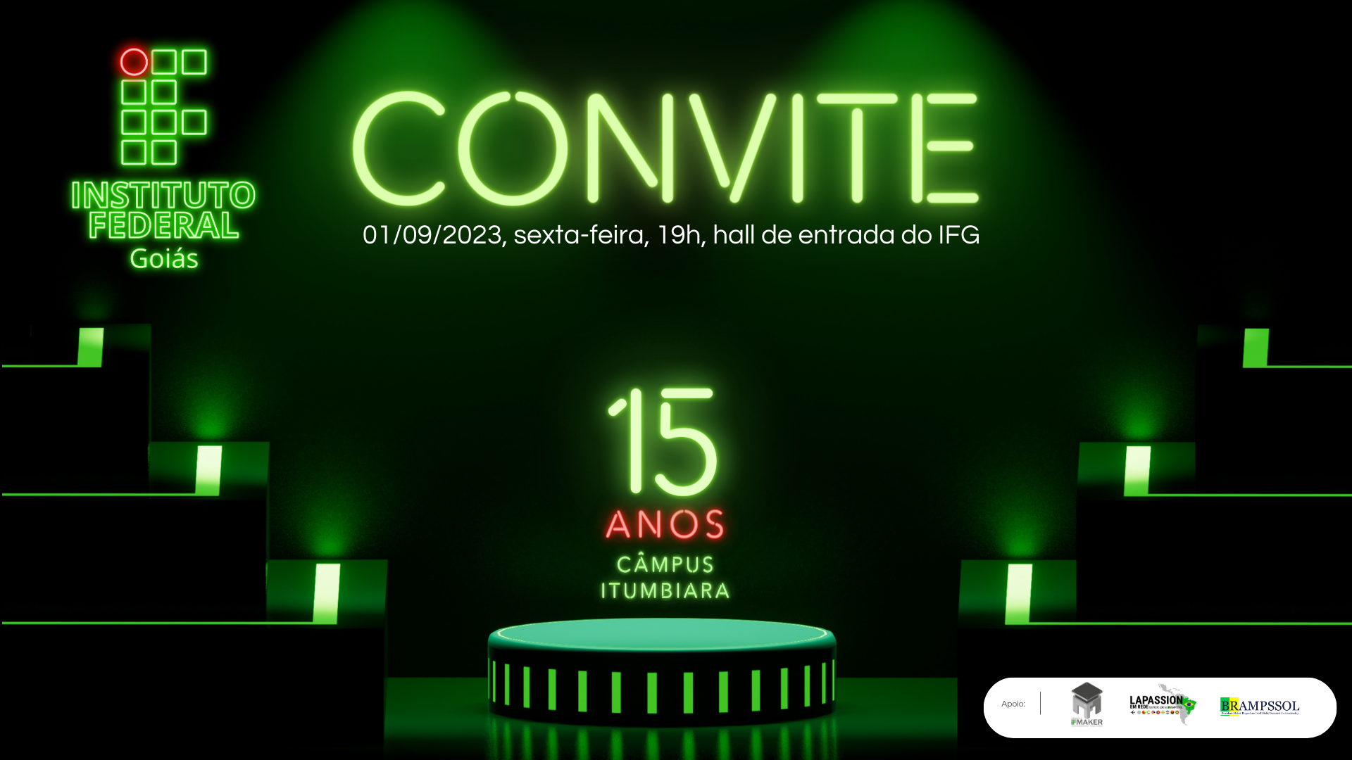 A Direção-Geral do IFG Câmpus Itumbiara convida para o aniversário de 15 anos da Unidade, a ser celebrado no próximo dia 1º de setembro de 2023, às 19h, no hall de entrada do Instituto.