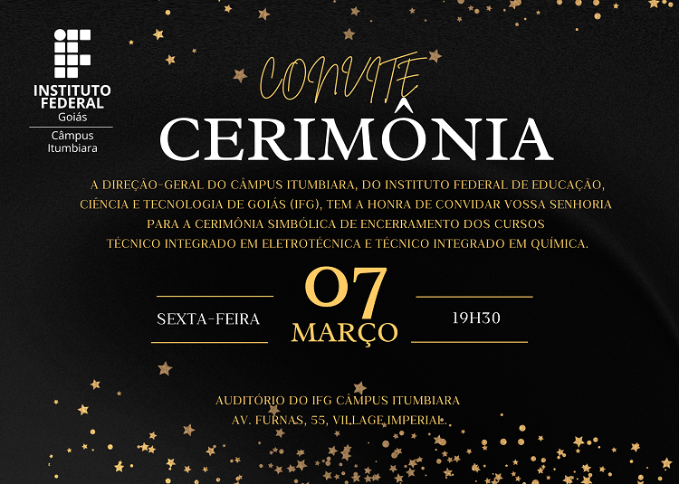 Prestigiem a cerimônia de encerramento dos cursos Técnicos Integrados Integrais na próxima semana, dia 7 de março, às 19h30, no auditório do Câmpus Itumbiara.