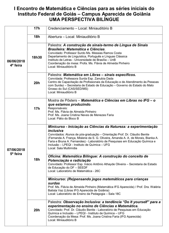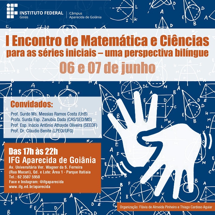 Nos dias 06 e 07 de junho o IFG Aparecida de Goiânia promove o I Encontro de Matemática e Ciências para as séries iniciais do Instituto Federal de Goiás – Campus Aparecida de Goiânia – uma perspectiva bilíngue.