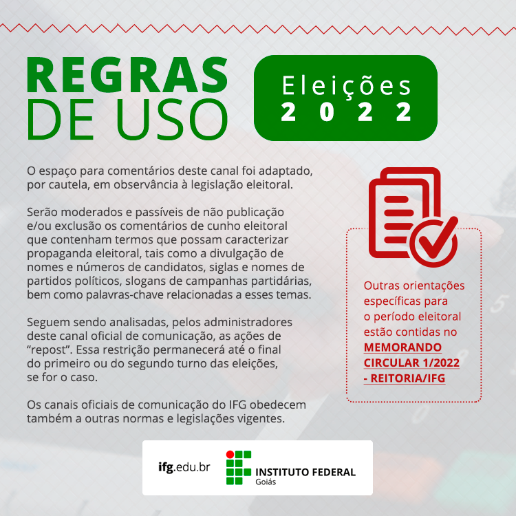 3) Restrições e medidas adicionais poderão ser adotadas pelos administradores deste/perfil e página, a qualquer momento, para que a legislação eleitoral seja integralmente cumprida no âmbito do IFG.