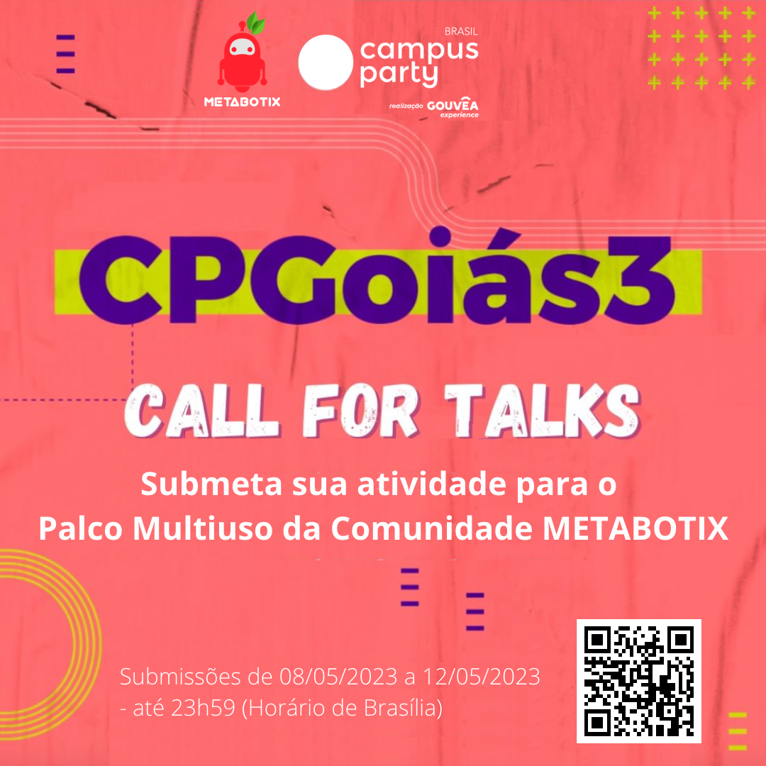 A Campus Party Goiás se aproxima e acontecerá entre os dias 7 e 11 de junho, no shopping Passeio das Águas em Goiânia. O evento é presencial, mas todas as atividades serão transmitidas nos canais oficiais da Campus Party e do Metabotix no Youtube. Este ano, a organização selecionou o Metabotix para curadoria em um dos palcos multiuso de comunidades.