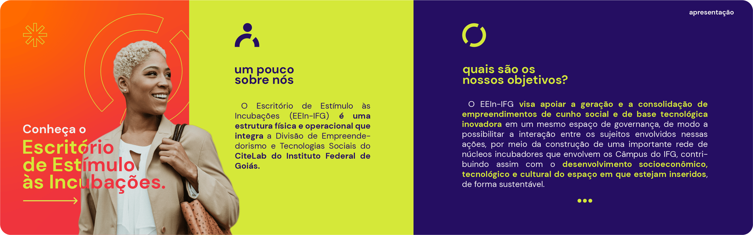 O Escritório de Estímulo às Incubações é um dos escritórios da Divisão de Empreendedorismo e Tecnologias Sociais do Centro de Pesquisa e Inovação do IFG (CiteLab). O objetivo principal é apoiar a geração e a consolidação de empreendimentos, prioritariamente de cunho social, que contribuam com o desenvolvimento socioeconômico, tecnológico e cultural do espaço em que esteja inserido, de forma sustentável, por meio da formação complementar de coletivos e empreendedores em áreas compatíveis, em seus aspectos técnicos e organizacionais, com as atividades de ensino, pesquisa e extensão oferecidas pelo IFG.