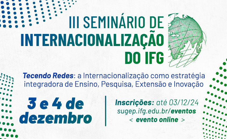 A Coordenação de Relações Internacionais do Instituto Federal de Goiás (IFG) realizará nos dias 3 e 4 de dezembro o III Seminário de Internacionalização do IFG, com o tema "Tecendo Redes: a Internacionalização como estratégia integradora de Ensino, Pesquisa, Extensão e Inovação". O evento será on-line e é destinado às pessoas interessadas no tema da internacionalização, sejam integrantes da comunidade acadêmica da Instituição ou da comunidade externa. As inscrições estão abertas e podem ser realizadas até o dia 3 de dezembro.