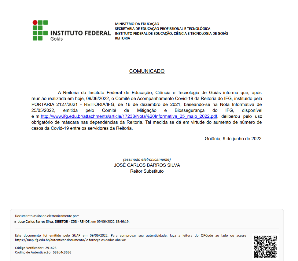 A Reitoria do Instituto Federal de Educação, Ciência e Tecnologia de Goiás informa que, após reunião realizada hoje, 09/06/2022, o Comitê de Acompanhamento Covid-19 da Reitoria do IFG, instituído pela