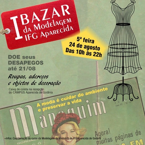 Alunos e professores do curso técnico integrado em Modelagem do Vestuário estão organizando um bazar de roupas usadas, adereços e objetos de decoração, com foco no aspecto da sustentabilidade ambiental na moda. A ação vai acontecer no dia 24 de agosto, das 10 às 21 horas, no Câmpus Aparecida de Goiânia do IFG, e será aberta a todas as pessoas interessadas. As peças serão vendidas a preços simbólicos e a renda revertida na aquisição de alimentos para pessoas carentes.