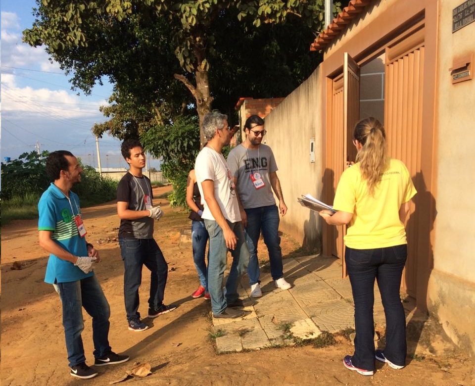 Equipe do projeto de extensão durante visita a uma das famílias da Vila Romana, para esclarecimentos sobre filtro sustentável