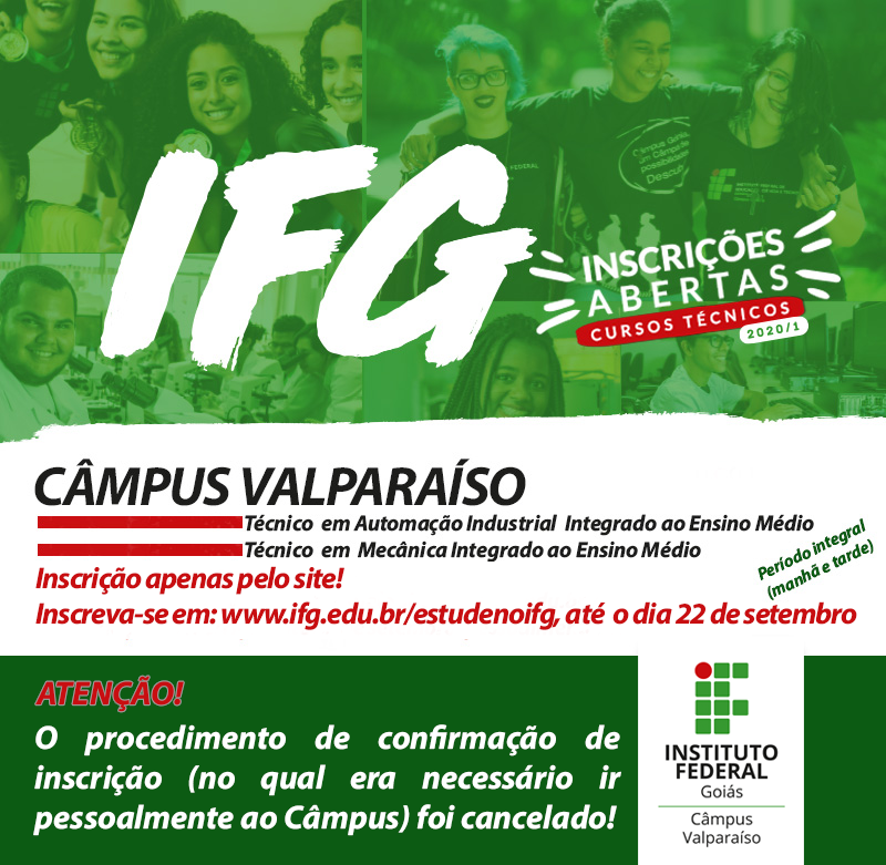 Já pensou em fazer o ensino médio e ao mesmo tempo um curso profissional? Aqui no Câmpus Valparaíso do Instituto Federal de Goiás (IFG), você pode! E tudo de forma gratuita. Para aqueles que estão terminando o 9º ano do ensino fundamental este ano, ou já tenham concluído o ensino fundamental, venham estudar com a gente ano que vem! É preciso fazer a inscrição no endereço eletrônico: www.ifg.edu.br/estudenoifg , menu "Técnico Integrado", até o dia 22 de setembro. O procedimento de confirmação previsto inicialmente, no qual você deveria entregar o formulário de pré-inscrição pessoalmente no Câmpus, foi cancelado. Acesse aqui o comunicado.