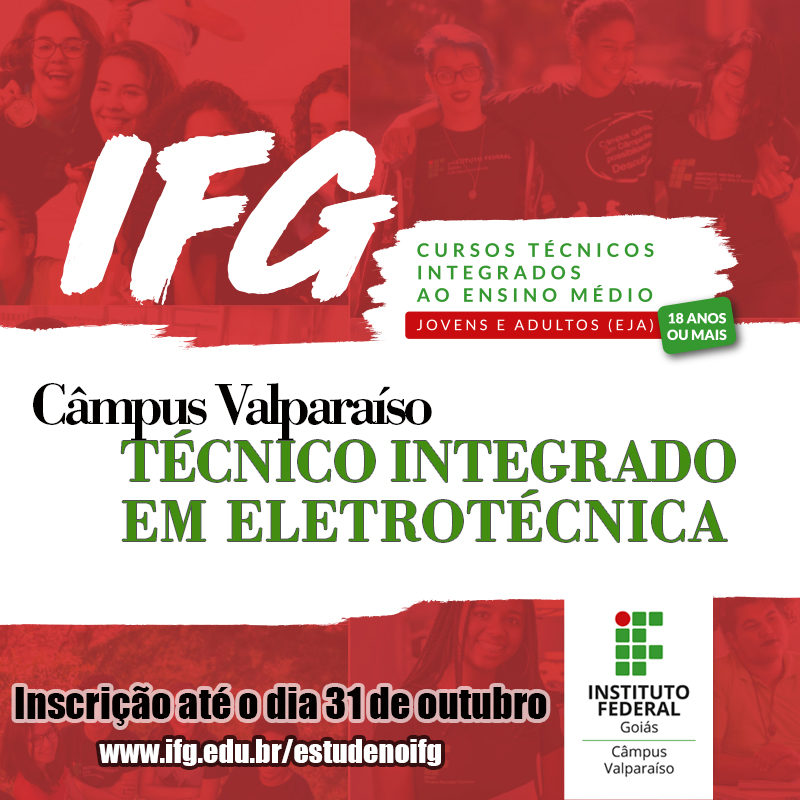Se você tem 18 anos ou mais, ainda não terminou o ensino médio, vem participar da nossa seleção para a turma de Educação de Jovens e Adultos (EJA). O Instituto Federal de Goiás (IFG) Câmpus Valparaíso está disponibilizando 36 vagas para o curso técnico integrado em Eletrotécnica na modalidade de Educação de Jovens e Adultos. Como se inscrever? Pelo site: www.ifg.edu.br/estudenoifg, menu "EJA- Educação de Jovens e Adultos", inscreva-se até o dia 31 de outubro. O que é o curso técnico integrado? Você faz o ensino médio e ao mesmo tempo adquire um curso profissional.
