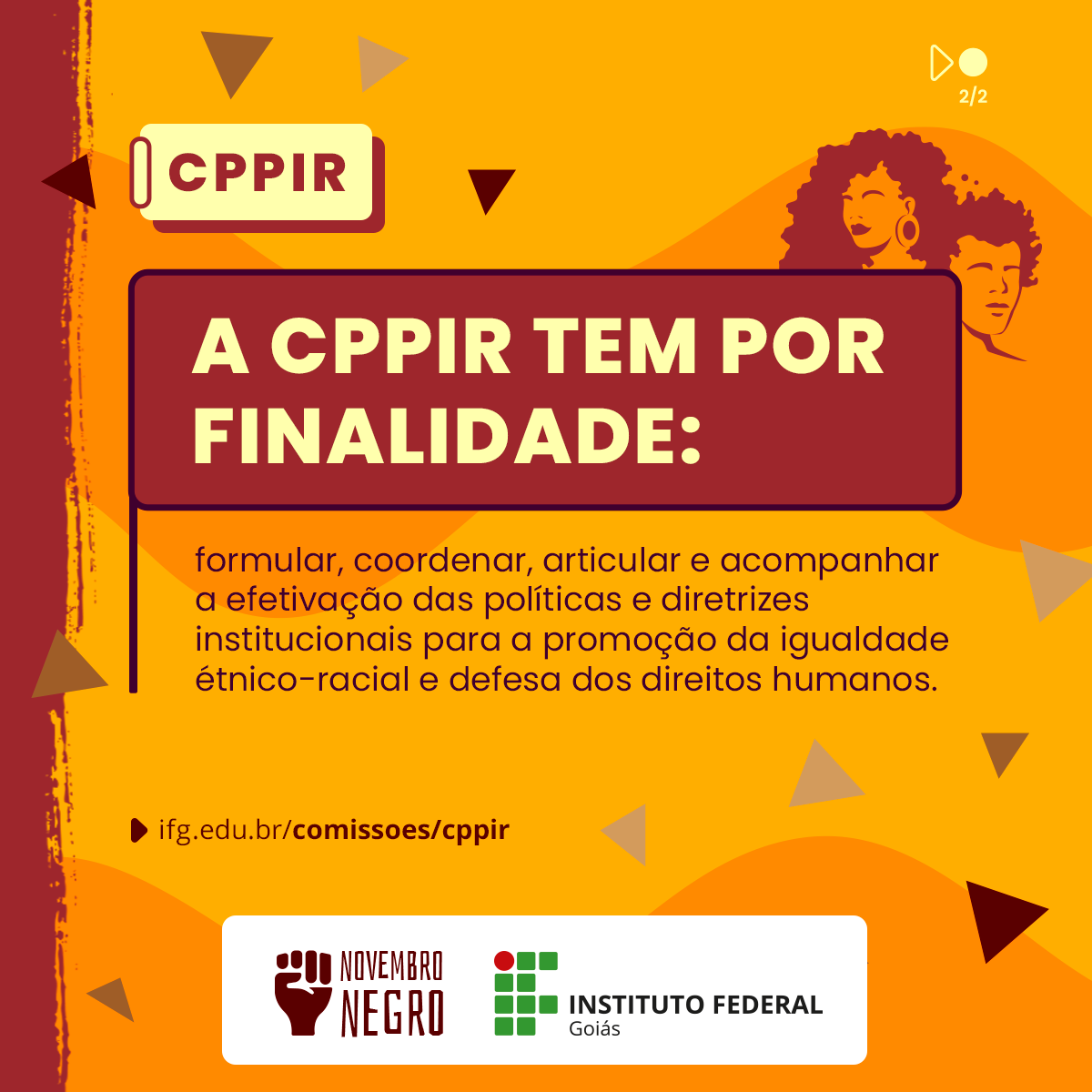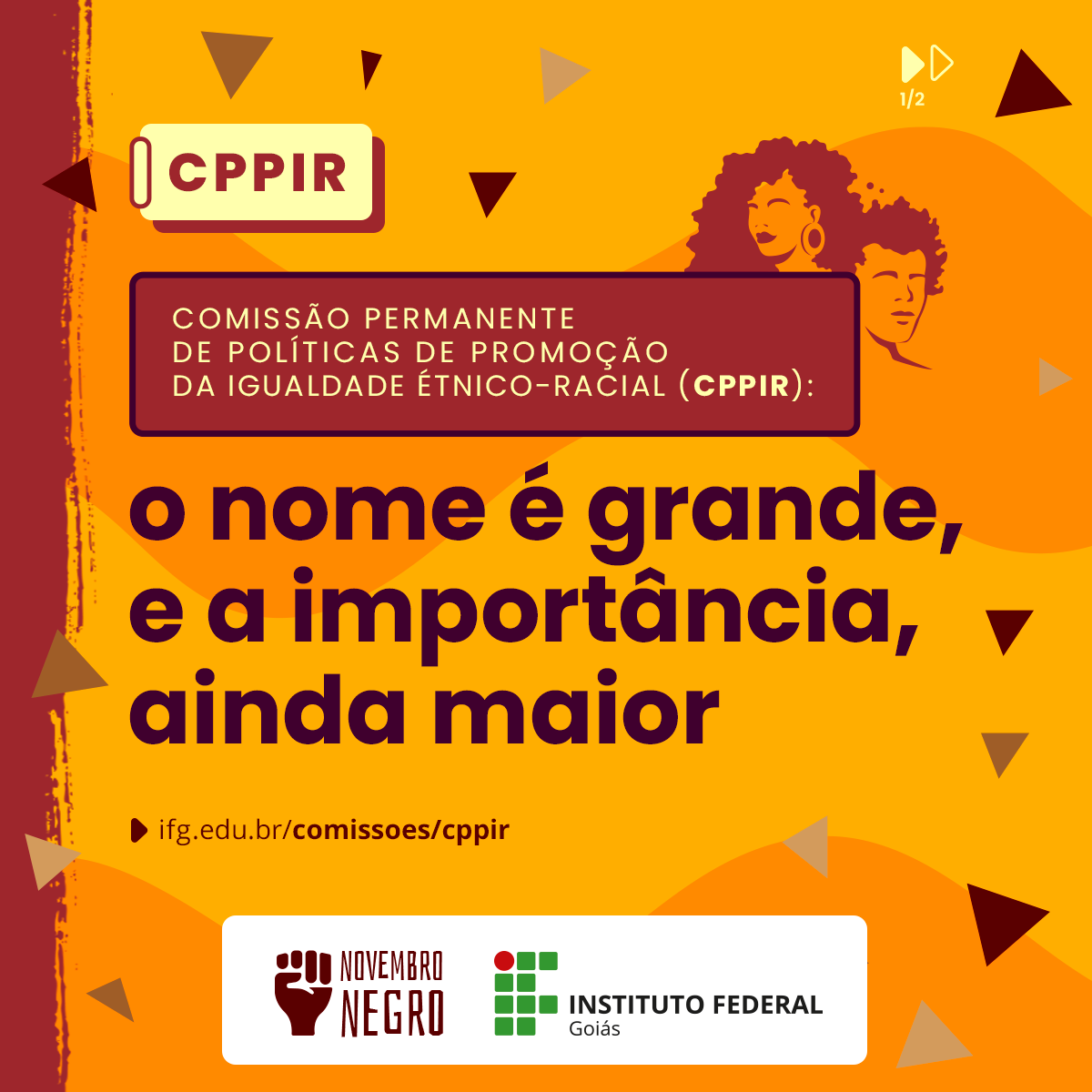 Em uma iniciativa da Diretoria de Comunicação Social (Dicom) do Instituto Federal de Goiás (IFG), em parceria com a Comissão Permanente de Políticas de Promoção da Igualdade Étnico-Racial (CPPIR), a Instituição dá início a um projeto estratégico muito importante: o "Novembro Negro".  Uma das ações consiste na realização de uma campanha de comunicação, que começa hoje e será publicada nas mídias sociais do IFG. Estão previstas diversas publicações com peças digitais.