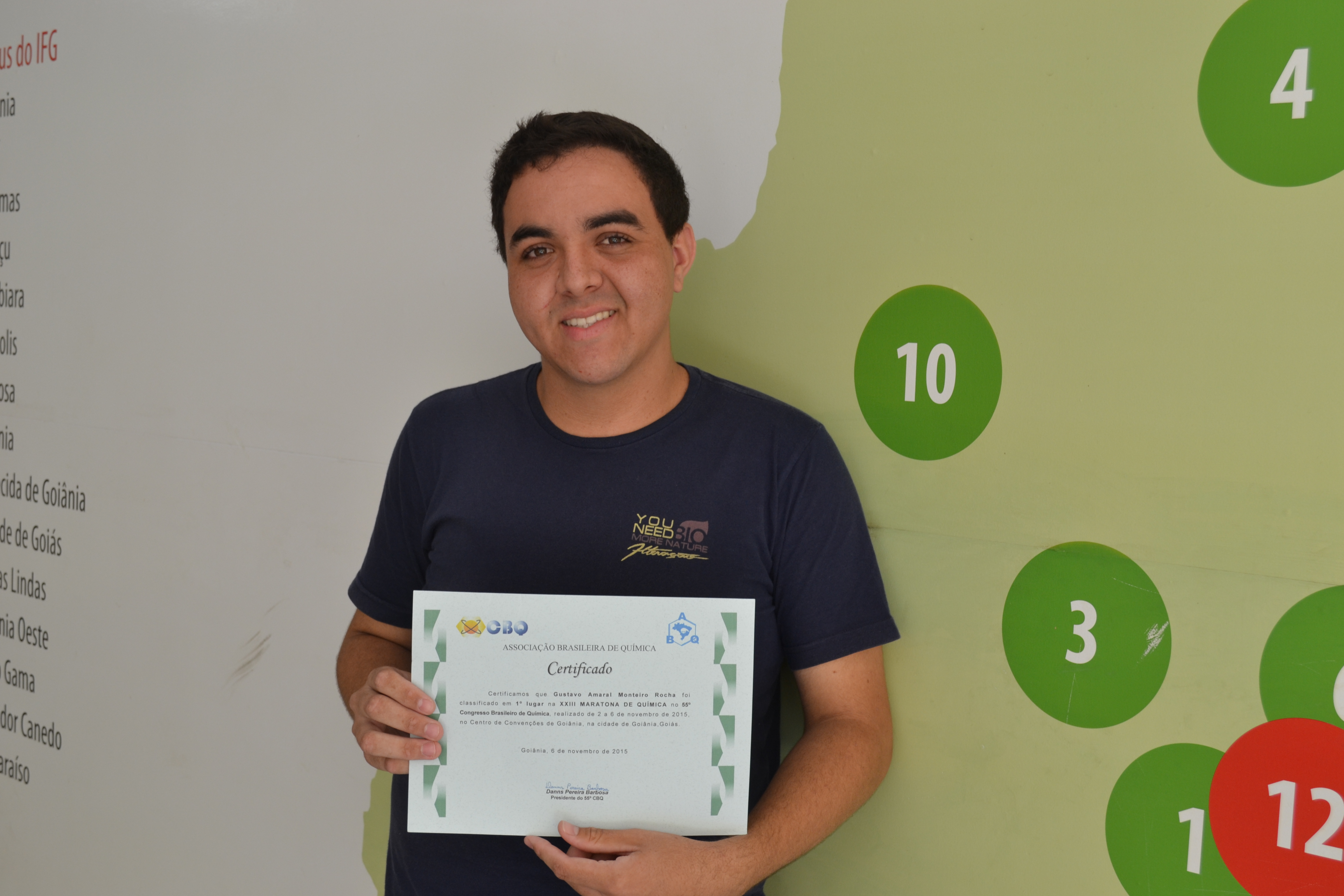 Durante o curso Técnico Integrado em Química no Câmpus Inhumas, Gustavo participou ativamente das atividades ligadas à pesquisa na instituição. Em 2015, por exemplo, ele fazia parte da equipe vencedora da primeira edição do Desafio IFG (competição de plano de negócio e inovação) e que também competiu no I2P Latin America. No mesmo ano, o estudante foi classificado em primeiro lugar na XXIII Maratona de Química, evento dentro do 55º Congresso Brasileiro de Química, que foi realizado em Goiânia.