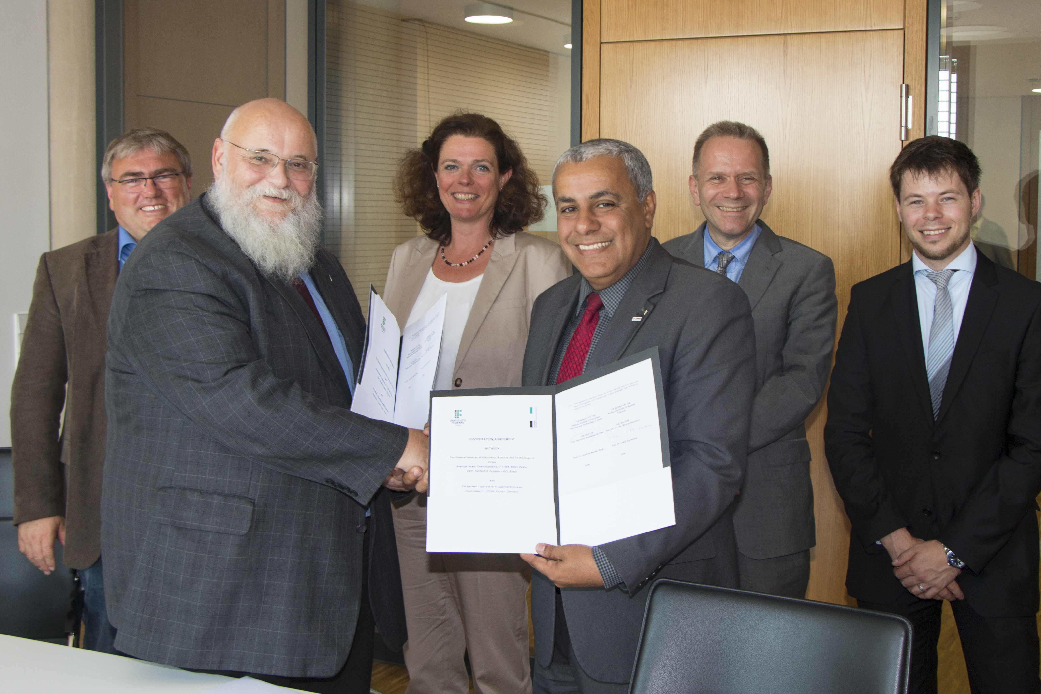 O Instituto Federal de Goiás (IFG) firmou acordo com a Universidade de Ciências Aplicadas de Aachen (FH Aachen) da Alemanha, instituição reconhecida por suas pesquisas realizadas no campo de energias renováveis. O documento que estabelece a parceria foi assinado no dia 7 de julho, em Aachen, na Alemanha, e contou com a presença do Reitor do IFG, professor Jerônimo Rodrigues da Silva, do Reitor da FH Aachen, Marcus Baumann, além dos professores Joachim Werner Zang, do Câmpus Goiânian do IFG, Isabel Kuperjans e Markus Grömping, da FH Aachen, e o pesquisador Sebastian Decker. O acordo terá validade até 31 de dezembro de 2022.