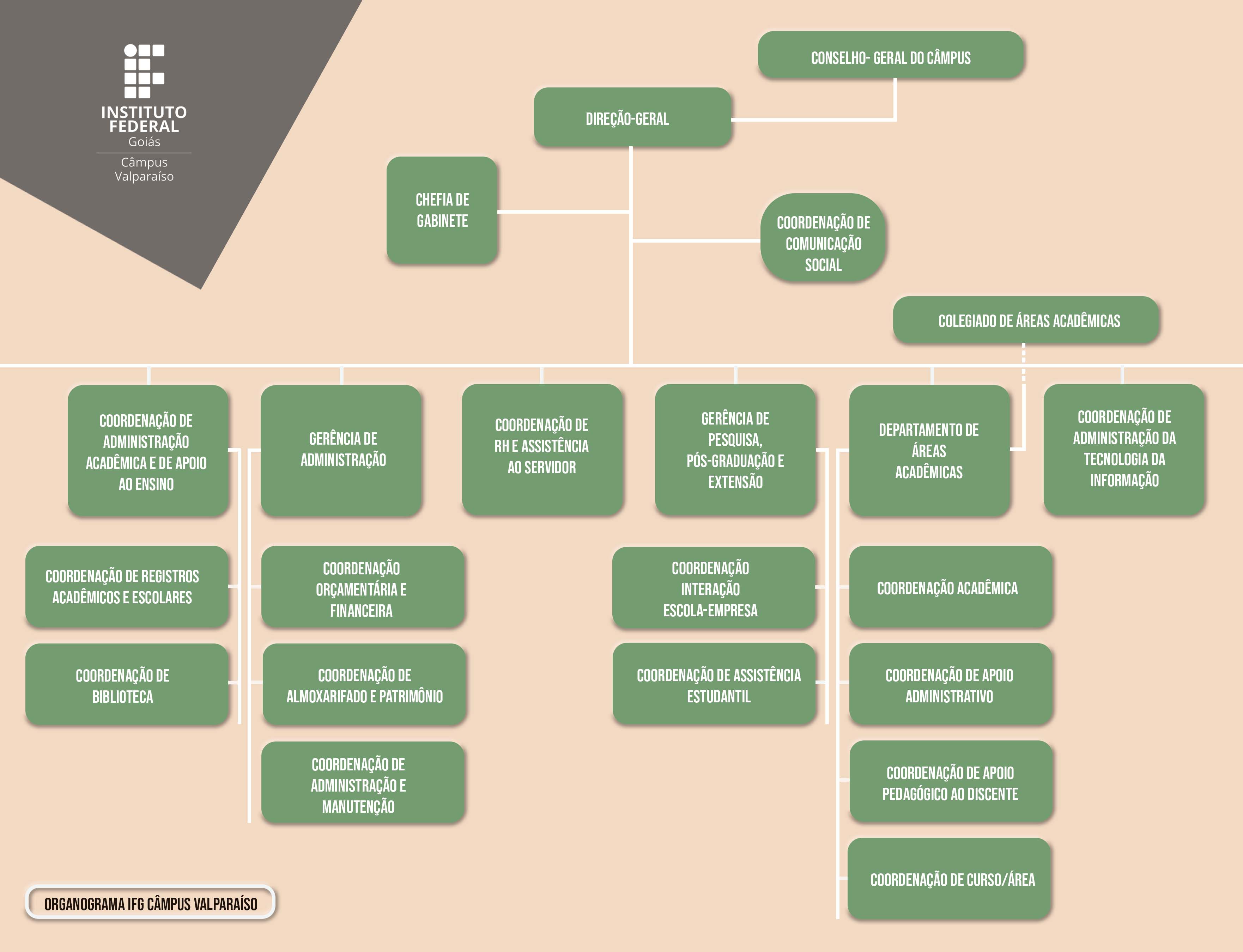 Logo abaixo segue imagem do ORGANOGRAMA SIMPLIFICADO. Para ver a estrutura organizacional completa do IFG Câmpus Valparaíso, acesse o Plano de Desenvolvimento Institucional do Instituto Federal de Goiás (PDI/IFG-2019-2023)