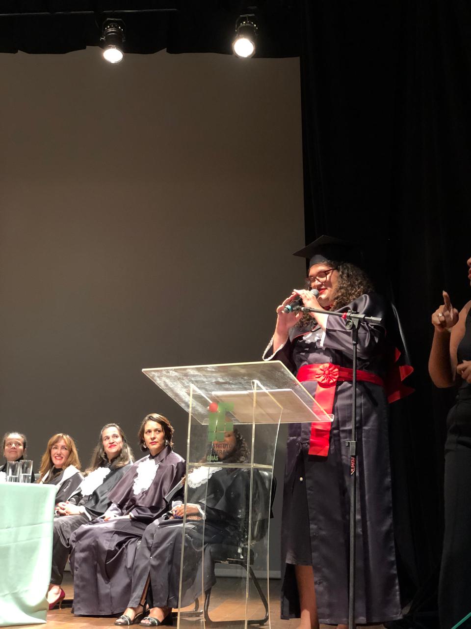Helena Caetana Ribeiro, que representou a turma de cinema, proferiu um discurso emocionante sobre as transformações e impactos da realização de um curso na área de audiovisual na Cidade de Goiás. “As dores e os amores que vivemos nas ruas de Goiás, essa cidade que nos ensinou coisas boas e ruins, jovens e sozinhos em um lugar novo, místico, em que nos apaixonamos e rivalizamos, o que nos nos moveu foi nossa paixão e o desejo de sermos cada vez melhores”. Helena também lembrou as dificuldades estruturais da educação pública e o quanto ainda pode ser melhorado para oferecer condições mais adequadas para os próximos estudantes. “Tenho o desejo utópico que o IFG um dia ofereça condições de permanência e êxito melhores aos que virão”.