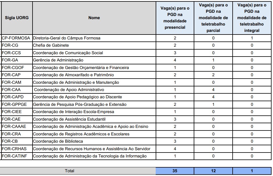 De acordo com o Anexo I do Edital nº 7/2025, o Câmpus Formosa disponibiliza um total de 35 vagas para o PGD na modalidade presencial, 12 vagas para teletrabalho parcial e 1 vaga para o taletrabalho integral. Confira abaixo a disposição de vagas por setor: