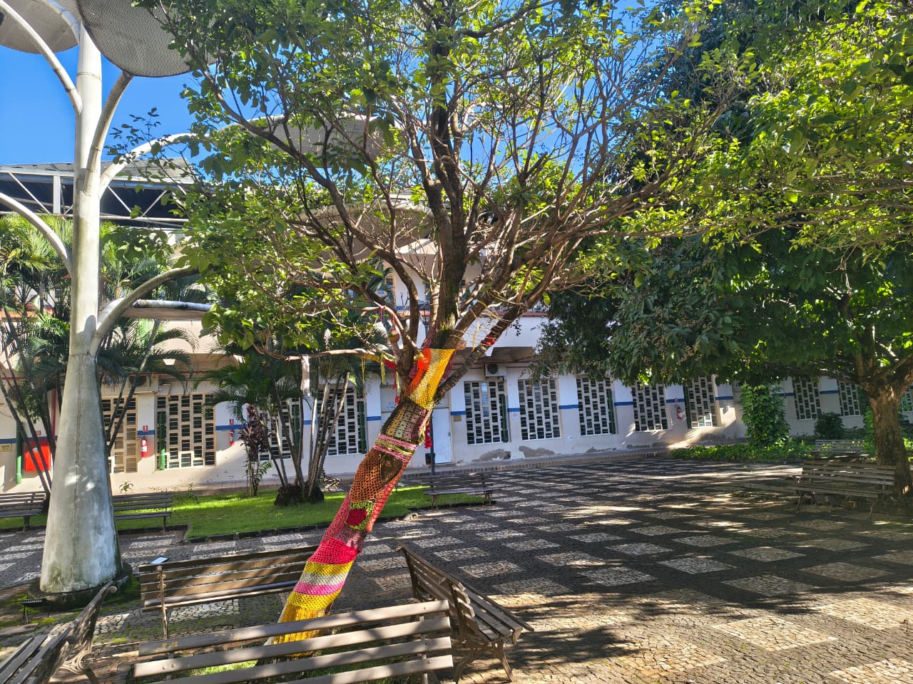 Árvore de crochê no pátio do Câmpus Goiânia. Intervenção artística criada pelo professora Ana Lúcia Siqueira com a participação de estudantes do curso técnico em Cozinha/Gastronomia (EJA) para a disciplina de Artes.