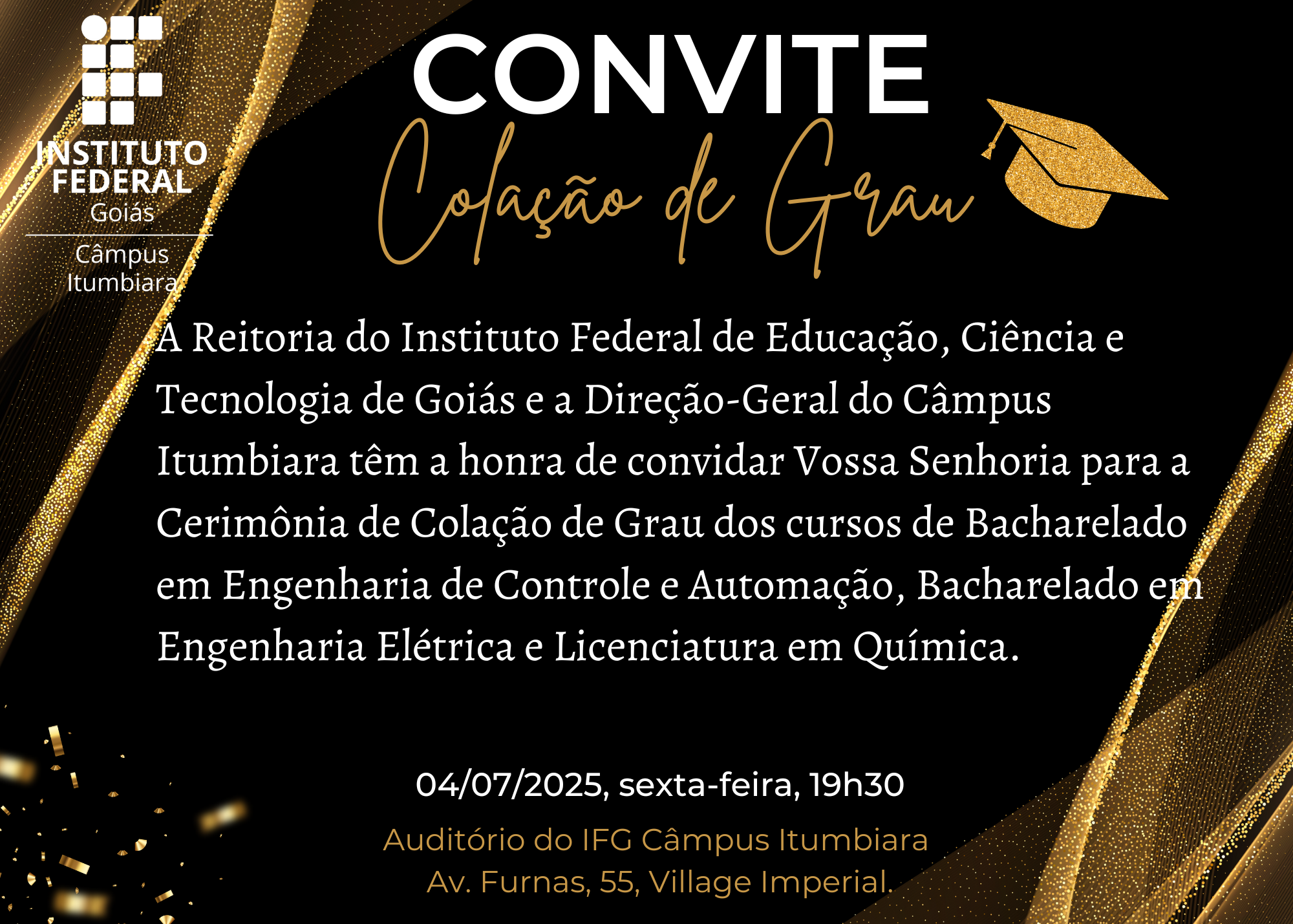 A Reitoria do Instituto Federal de Educação, Ciência e Tecnologia de Goiás e a Direção-Geral do Câmpus Itumbiara têm a honra de convidá-lo para a Cerimônia de Colação de Grau dos cursos de Bacharelado em Engenharia de Controle e Automação, Bacharelado em Engenharia Elétrica e Licenciatura em Química.
