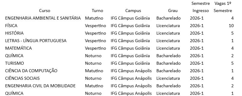 Segundo a Pró-Reitoria de Ensino, no IFG, “os câmpus Anápolis e Goiânia estão com vagas abertas destinadas ao Programa nos cursos de bacharelado em Ciência da Computação, Engenharia Ambiental e Sanitária, Engenharia Civil da Mobilidade, Turismo e de licenciatura em Ciências Sociais, Física, História, Letras Português, Matemática e Química”.  Confira o quadro de vagas referentes ao IFG: